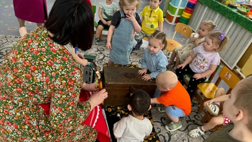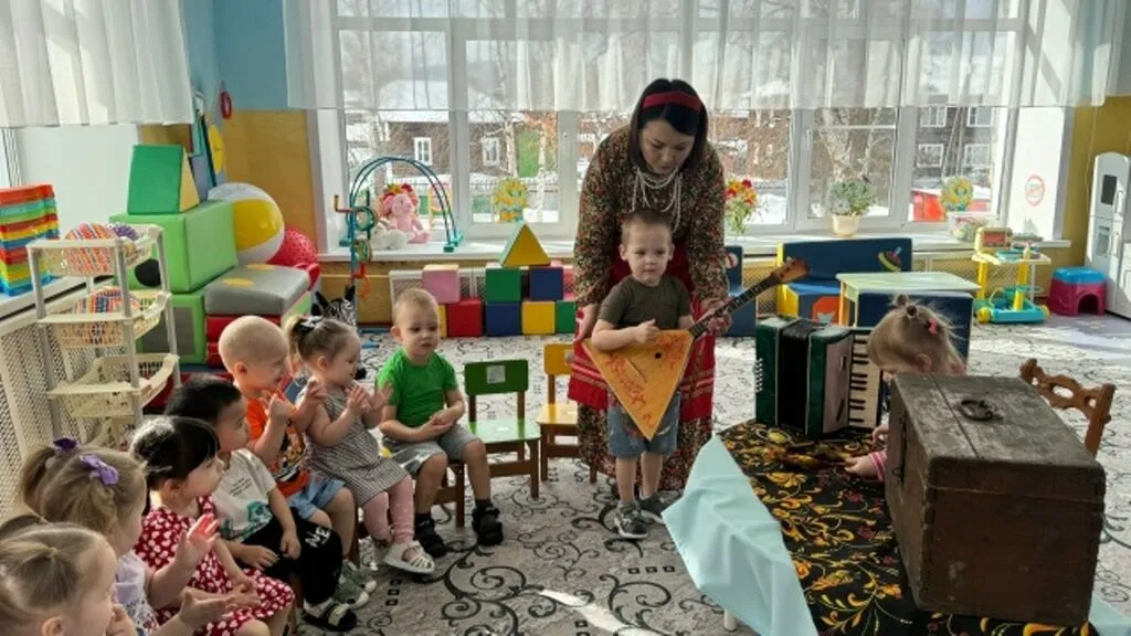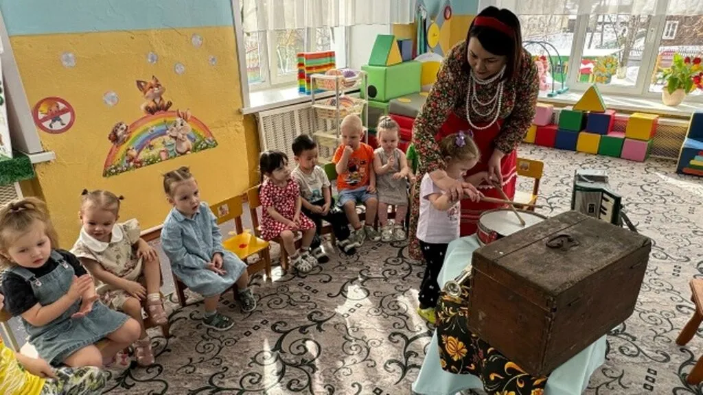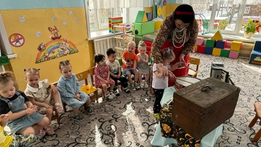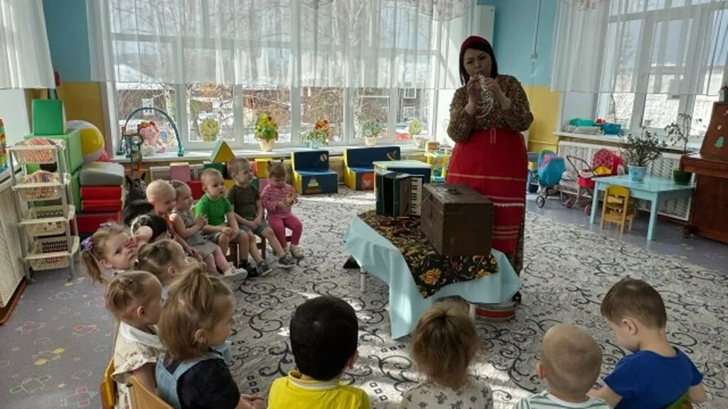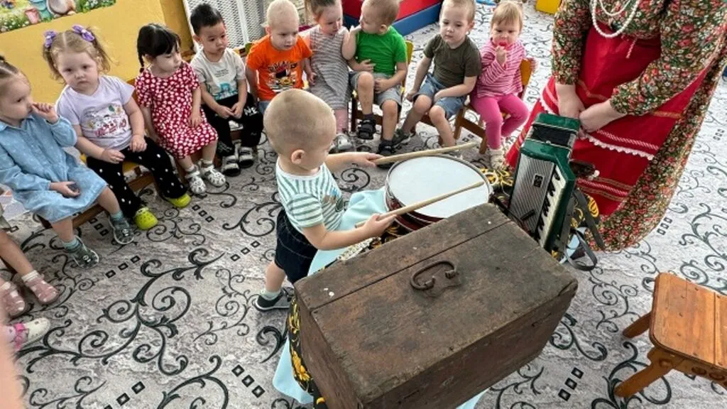Ведущая открыла для детей удивительный мир народных инструментов: деревянные ложки, барабан, гармошка, балалайка, бубен и многое другое. Ребята не только услышали, как звучит каждый инструмент, но и смогли подержать их в руках и даже попробовать сыграть!