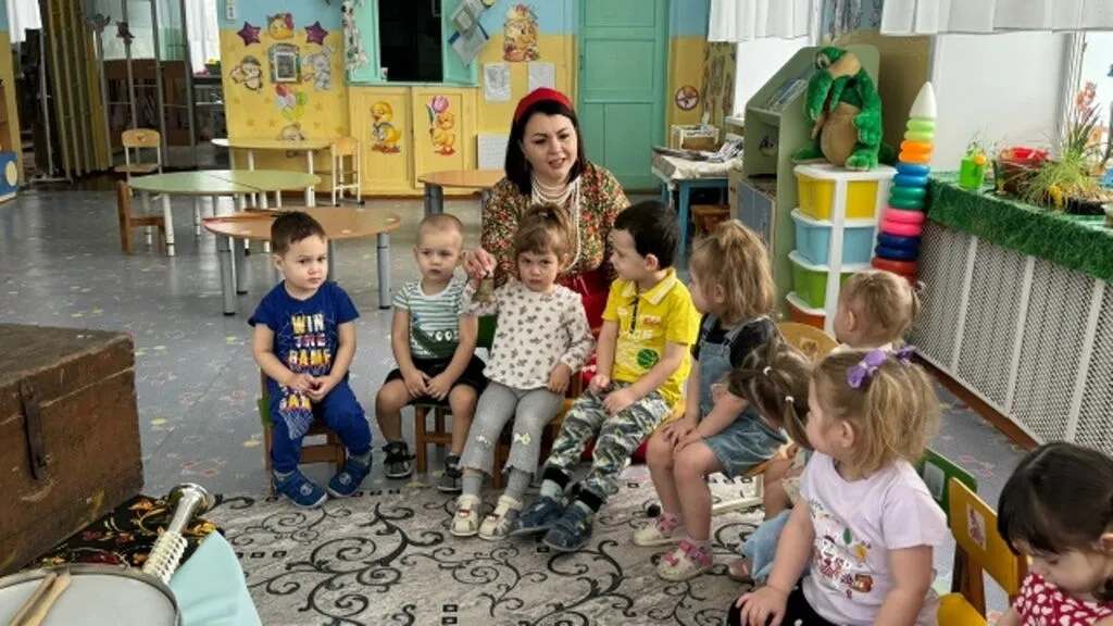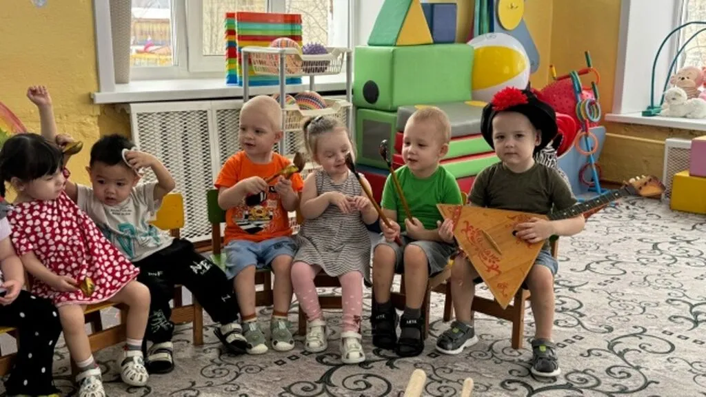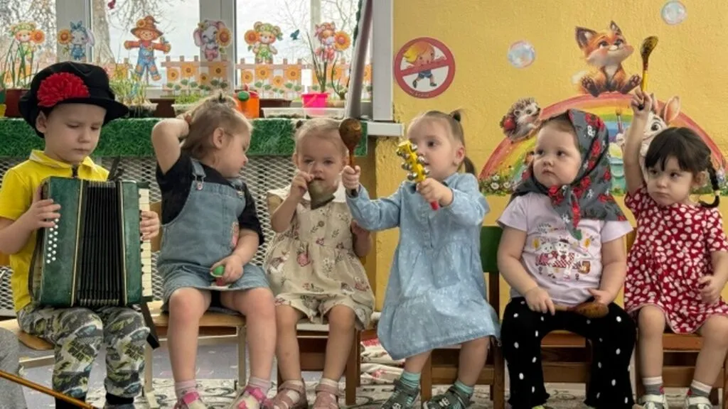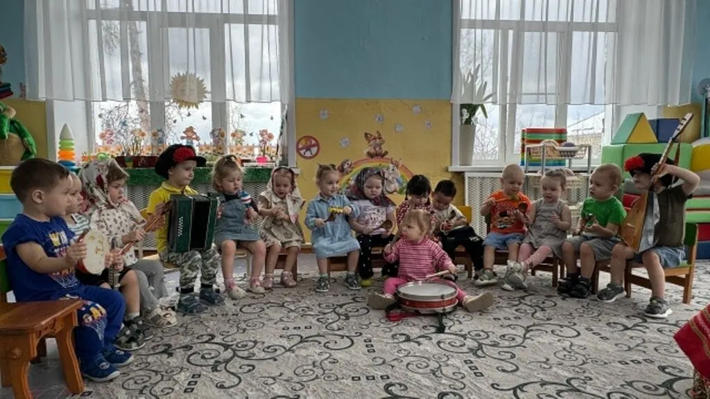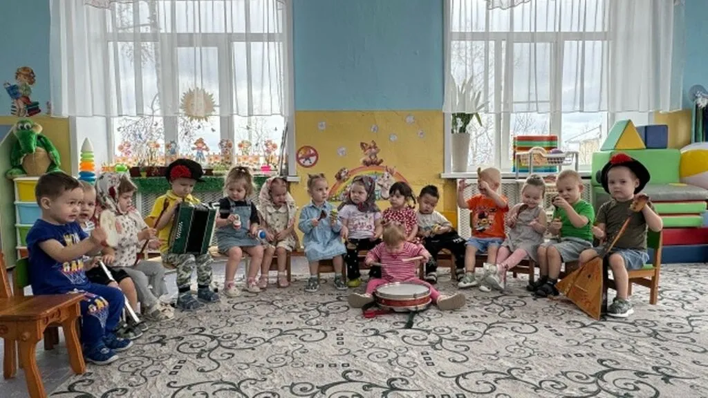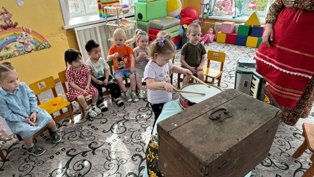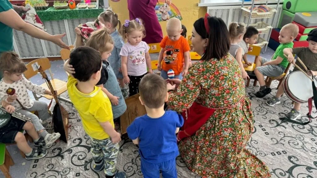 Интерес был огромный: каждый хотел прикоснуться к музыке. Вместе поиграли в ритмичную игру с бубном, а затем собрались в настоящий детский оркестр!